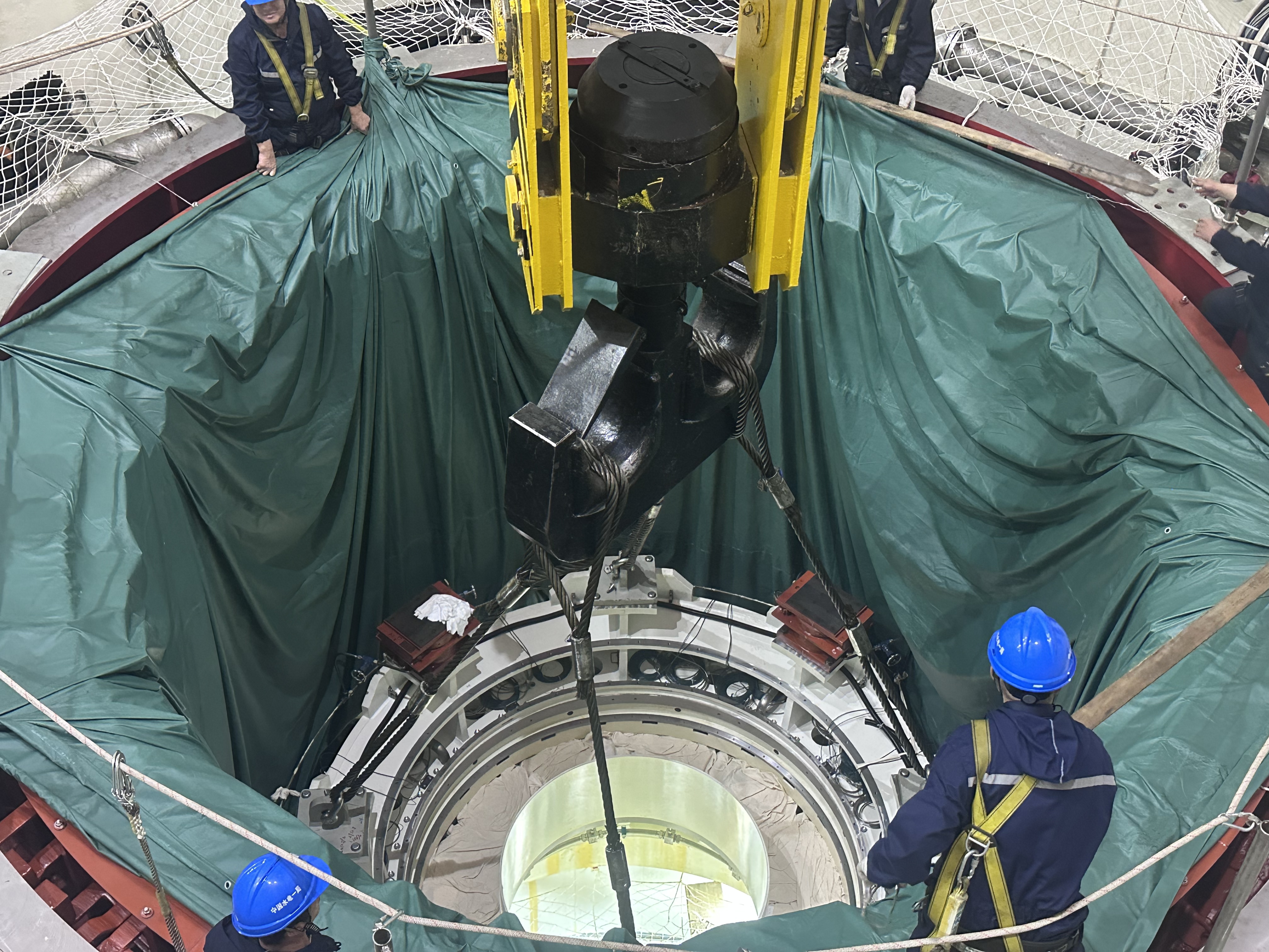 在轉(zhuǎn)子回裝過程中,隨著指令聲落,重達282.12噸的發(fā)電機轉(zhuǎn)子平穩(wěn)落入機坑,精準到達預定位置。由于其體積龐大、重量巨大,且與定子間隙極小,回裝過程要求極高的精確度和穩(wěn)定性,堪稱“毫米級的藝術(shù)”。面對挑戰(zhàn),作業(yè)人員采用先進測量技術(shù)反復校準,運用大型專用吊具平穩(wěn)起吊,全程嚴格執(zhí)行標準化作業(yè)。最終,轉(zhuǎn)子中心、水平度等關(guān)鍵指標均達到優(yōu)良標準,實現(xiàn)了“零偏差”的精準對接,受到業(yè)主、廠家的一致好評。